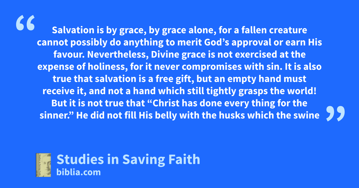 Salvation is by grace, by grace alone, for a fallen creature cannot possibly do anything to merit God’s approval or earn His favour. Nevertheless, Divine grace is not exercised at the expense of holiness, for it never compromises with sin. It is also true that salvation is a free gift, but an empty hand must receive it, and not a hand which still tightly grasps the world! But it is not true that “Christ has done every thing for the sinner.” He did not fill His belly with the husks which the swine