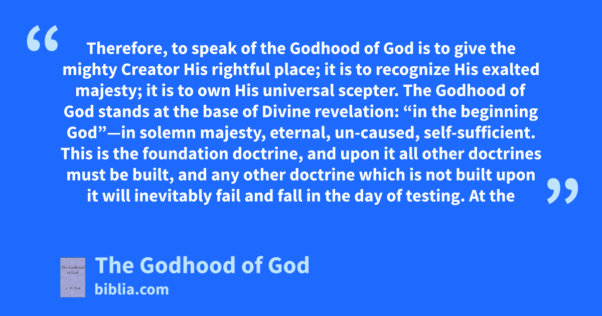 Therefore, to speak of the Godhood of God is to give the mighty Creator His rightful place; it is to recognize His exalted majesty; it is to own His universal scepter. The Godhood of God stands at the base of Divine revelation: “in the beginning God”—in solemn majesty, eternal, un-caused, self-sufficient. This is the foundation doctrine, and upon it all other doctrines must be built, and any other doctrine which is not built upon it will inevitably fail and fall in the day of testing. At the