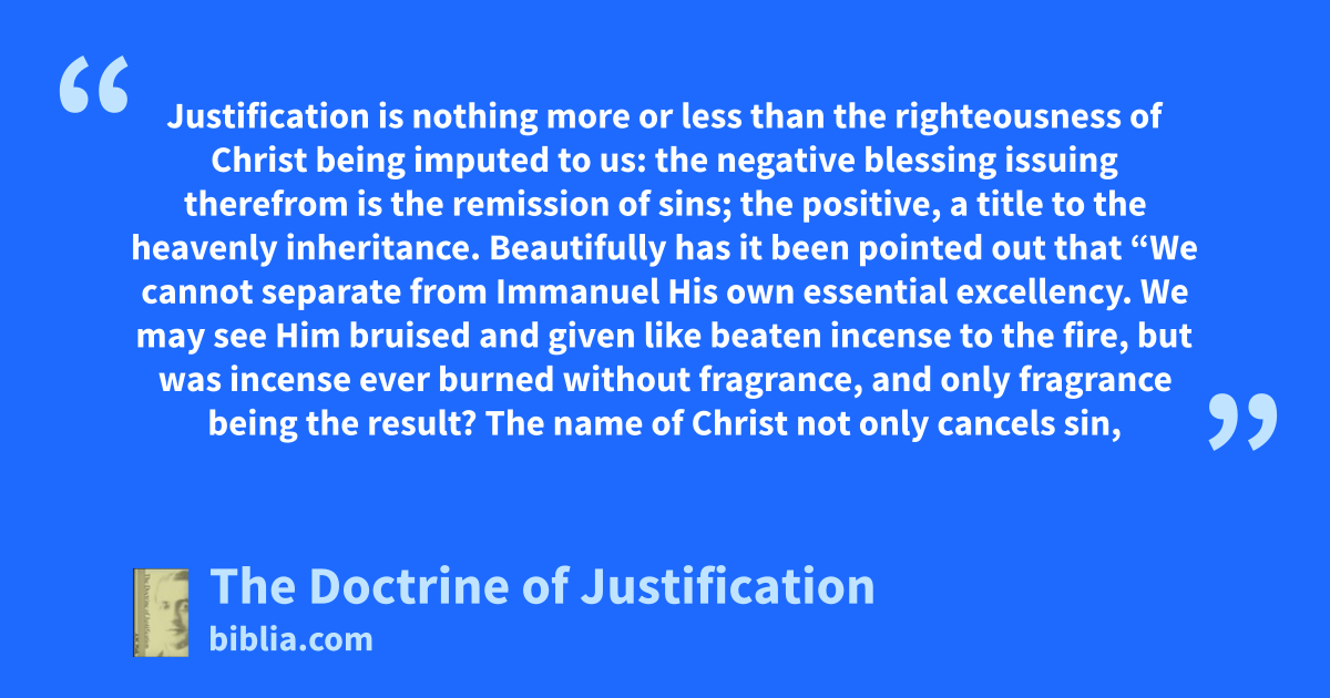 Justification is nothing more or less than the righteousness of Christ being imputed to us: the negative blessing issuing therefrom is the remission of sins; the positive, a title to the heavenly inheritance. Beautifully has it been pointed out that “We cannot separate from Immanuel His own essential excellency. We may see Him bruised and given like beaten incense to the fire, but was incense ever burned without fragrance, and only fragrance being the result? The name of Christ not only cancels sin,