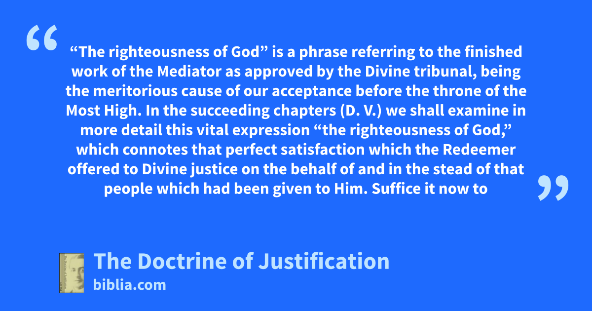 “The righteousness of God” is a phrase referring to the finished work of the Mediator as approved by the Divine tribunal, being the meritorious cause of our acceptance before the throne of the Most High. In the succeeding chapters (D. V.) we shall examine in more detail this vital expression “the righteousness of God,” which connotes that perfect satisfaction which the Redeemer offered to Divine justice on the behalf of and in the stead of that people which had been given to Him. Suffice it now to