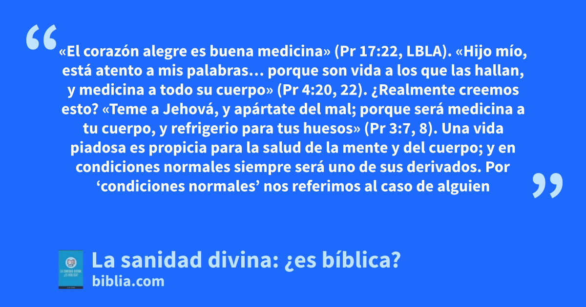 «El corazón alegre es buena medicina» (Pr 17:22, LBLA). «Hijo mío, está atento a mis palabras… porque son vida a los que las hallan, y medicina a todo su cuerpo» (Pr 4:20, 22). ¿Realmente creemos esto? «Teme a Jehová, y apártate del mal; porque será medicina a tu cuerpo, y refrigerio para tus huesos» (Pr 3:7, 8). Una vida piadosa es propicia para la salud de la mente y del cuerpo; y en condiciones normales siempre será uno de sus derivados. Por ‘condiciones normales’ nos referimos al caso de alguien