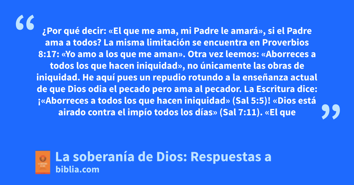 ¿Por qué decir: «El que me ama, mi Padre le amará», si el Padre ama a todos? La misma limitación se encuentra en Proverbios 8:17: «Yo amo a los que me aman». Otra vez leemos: «Aborreces a todos los que hacen iniquidad», no únicamente las obras de iniquidad. He aquí pues un repudio rotundo a la enseñanza actual de que Dios odia el pecado pero ama al pecador. La Escritura dice: ¡«Aborreces a todos los que hacen iniquidad» (Sal 5:5)! «Dios está airado contra el impío todos los días» (Sal 7:11). «El que