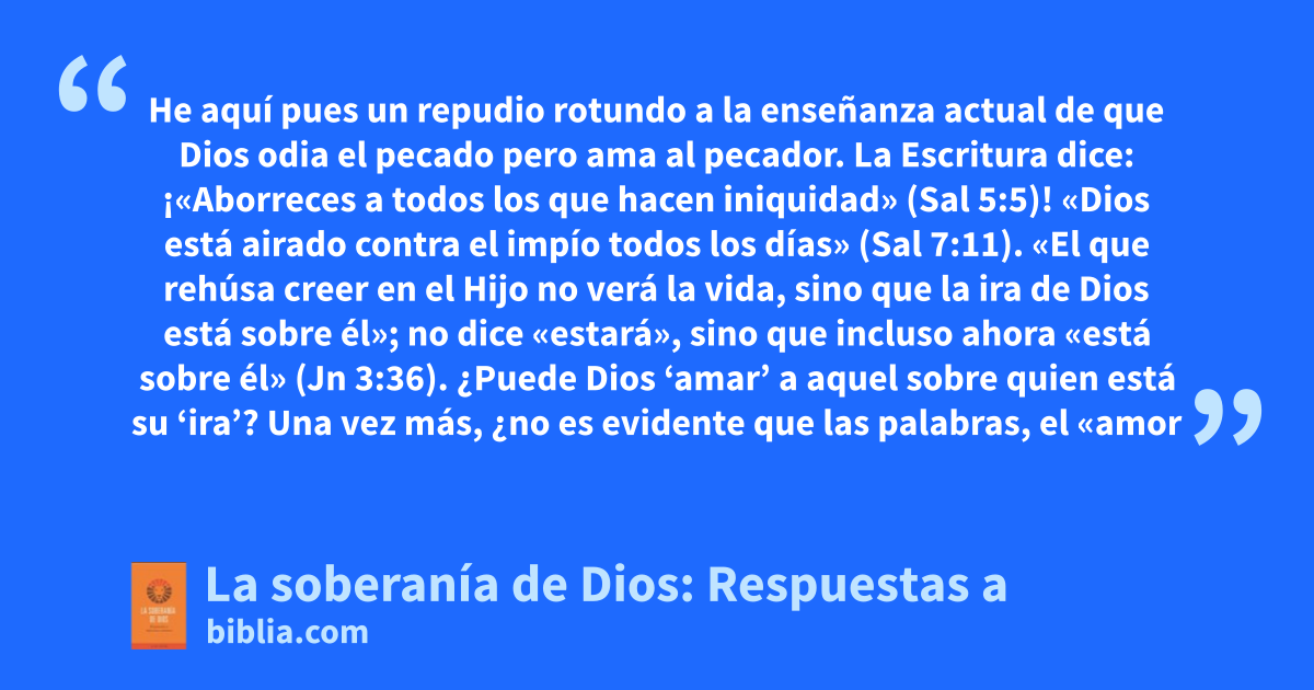 He aquí pues un repudio rotundo a la enseñanza actual de que Dios odia el pecado pero ama al pecador. La Escritura dice: ¡«Aborreces a todos los que hacen iniquidad» (Sal 5:5)! «Dios está airado contra el impío todos los días» (Sal 7:11). «El que rehúsa creer en el Hijo no verá la vida, sino que la ira de Dios está sobre él»; no dice «estará», sino que incluso ahora «está sobre él» (Jn 3:36). ¿Puede Dios ‘amar’ a aquel sobre quien está su ‘ira’? Una vez más, ¿no es evidente que las palabras, el «amor