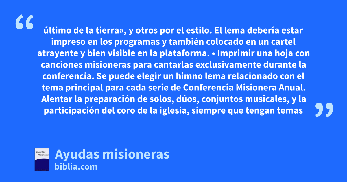 último de la tierra», y otros por el estilo. El lema debería estar impreso en los programas y también colocado en un cartel atrayente y bien visible en la plataforma. • Imprimir una hoja con canciones misioneras para cantarlas exclusivamente durante la conferencia. Se puede elegir un himno lema relacionado con el tema principal para cada serie de Conferencia Misionera Anual. Alentar la preparación de solos, dúos, conjuntos musicales, y la participación del coro de la iglesia, siempre que tengan temas