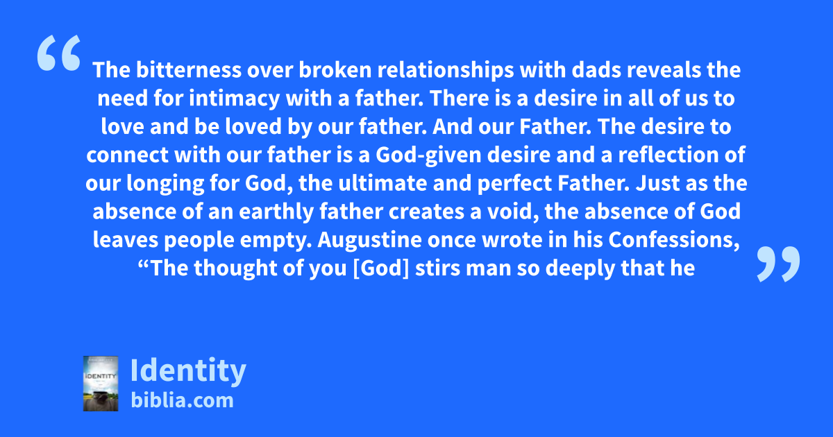 The bitterness over broken relationships with dads reveals the need for intimacy with a father. There is a desire in all of us to love and be loved by our father. And our Father. The desire to connect with our father is a God-given desire and a reflection of our longing for God, the ultimate and perfect Father. Just as the absence of an earthly father creates a void, the absence of God leaves people empty. Augustine once wrote in his Confessions, “The thought of you [God] stirs man so deeply that he