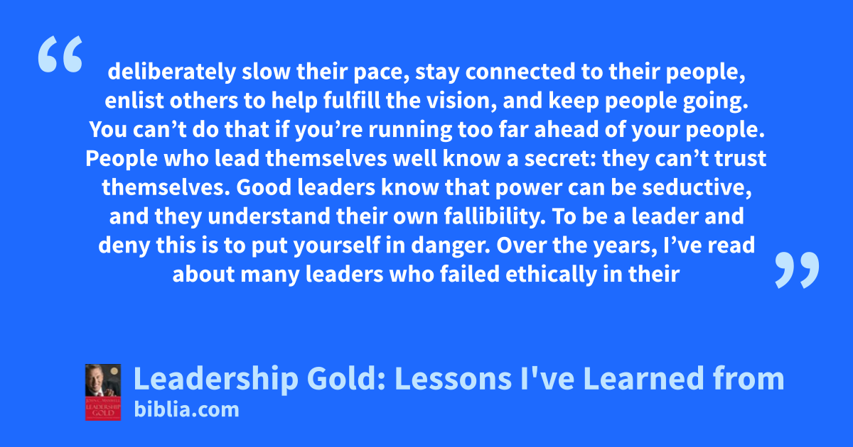 deliberately slow their pace, stay connected to their people, enlist others to help fulfill the vision, and keep people going. You can’t do that if you’re running too far ahead of your people. People who lead themselves well know a secret: they can’t trust themselves. Good leaders know that power can be seductive, and they understand their own fallibility. To be a leader and deny this is to put yourself in danger. Over the years, I’ve read about many leaders who failed ethically in their