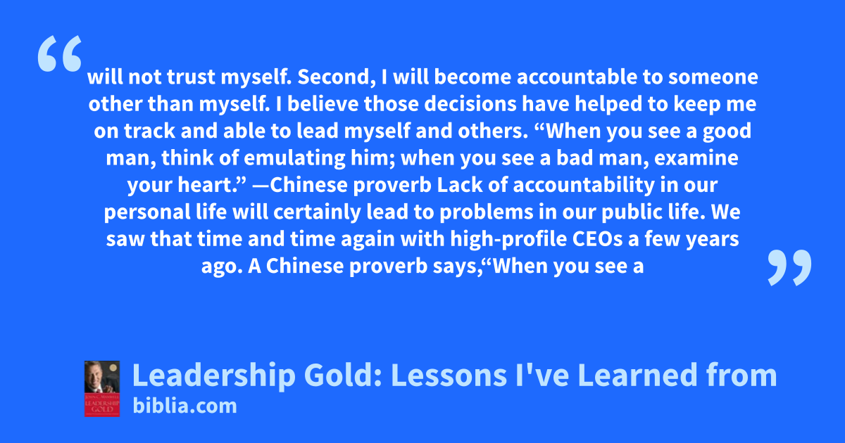 will not trust myself. Second, I will become accountable to someone other than myself. I believe those decisions have helped to keep me on track and able to lead myself and others. “When you see a good man, think of emulating him; when you see a bad man, examine your heart.” —Chinese proverb Lack of accountability in our personal life will certainly lead to problems in our public life. We saw that time and time again with high-profile CEOs a few years ago. A Chinese proverb says,“When you see a