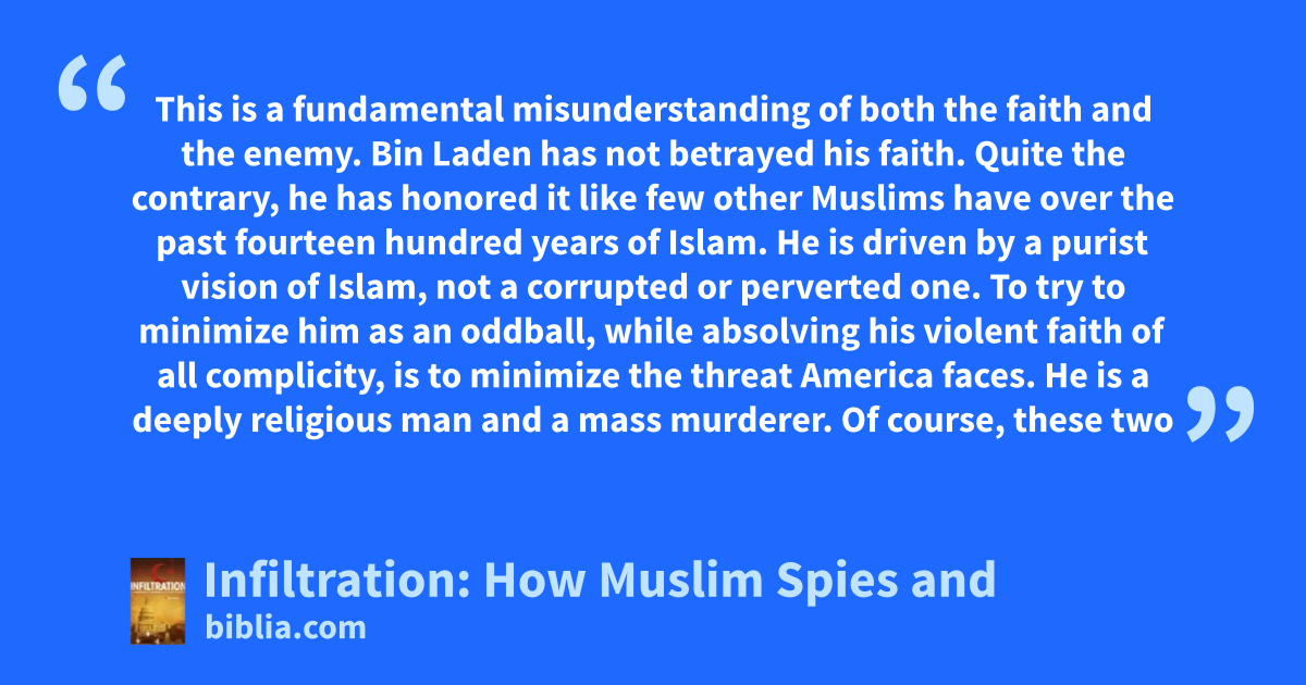 This is a fundamental misunderstanding of both the faith and the enemy. Bin Laden has not betrayed his faith. Quite the contrary, he has honored it like few other Muslims have over the past fourteen hundred years of Islam. He is driven by a purist vision of Islam, not a corrupted or perverted one. To try to minimize him as an oddball, while absolving his violent faith of all complicity, is to minimize the threat America faces. He is a deeply religious man and a mass murderer. Of course, these two