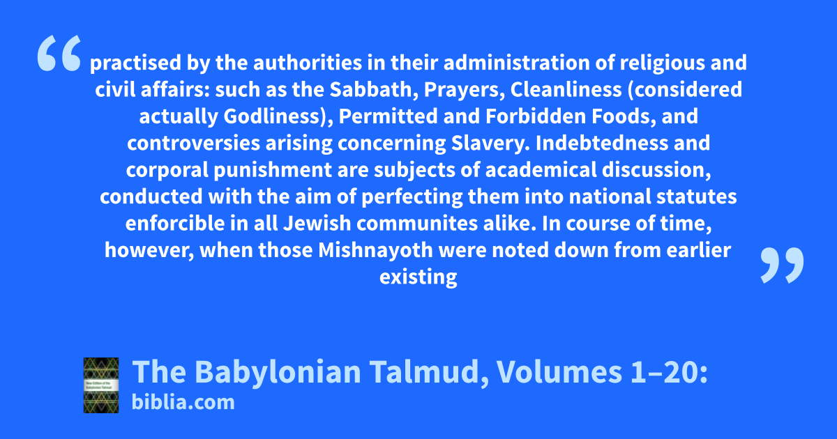 practised by the authorities in their administration of religious and civil affairs: such as the Sabbath, Prayers, Cleanliness (considered actually Godliness), Permitted and Forbidden Foods, and controversies arising concerning Slavery. Indebtedness and corporal punishment are subjects of academical discussion, conducted with the aim of perfecting them into national statutes enforcible in all Jewish communites alike. In course of time, however, when those Mishnayoth were noted down from earlier existing