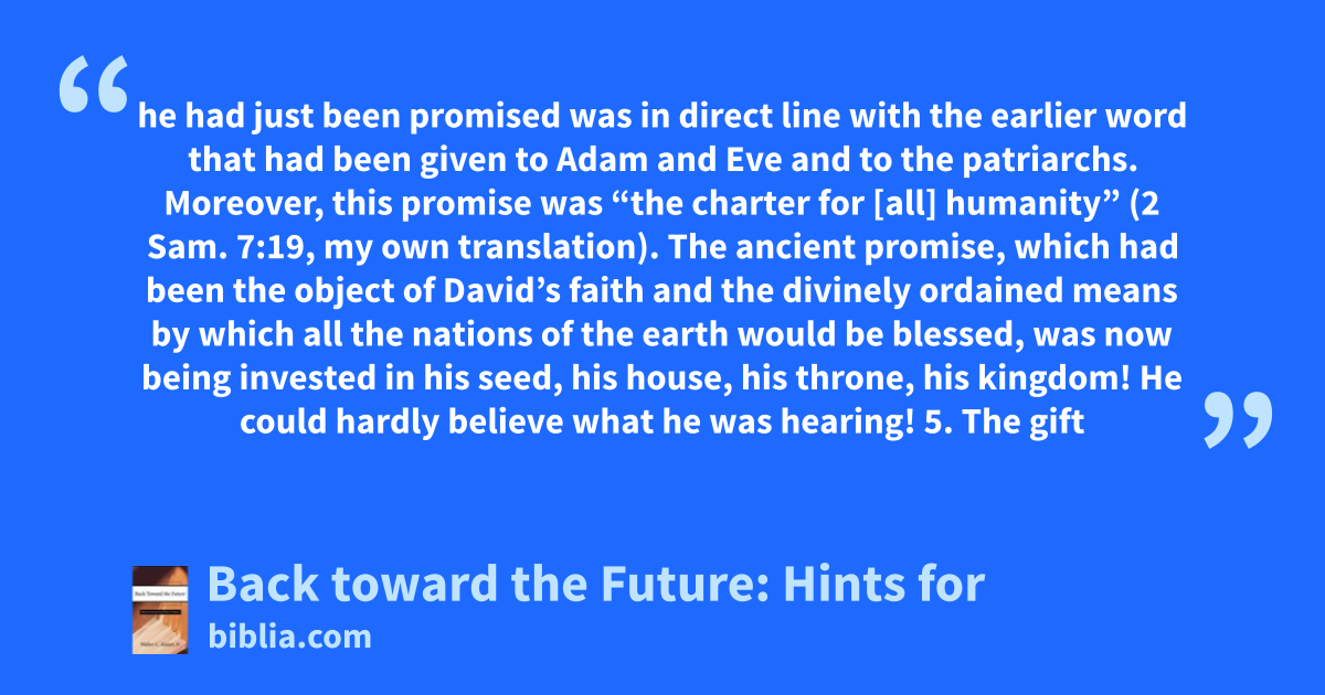 he had just been promised was in direct line with the earlier word that had been given to Adam and Eve and to the patriarchs. Moreover, this promise was “the charter for [all] humanity” (2 Sam. 7:19, my own translation). The ancient promise, which had been the object of David’s faith and the divinely ordained means by which all the nations of the earth would be blessed, was now being invested in his seed, his house, his throne, his kingdom! He could hardly believe what he was hearing! 5. The gift