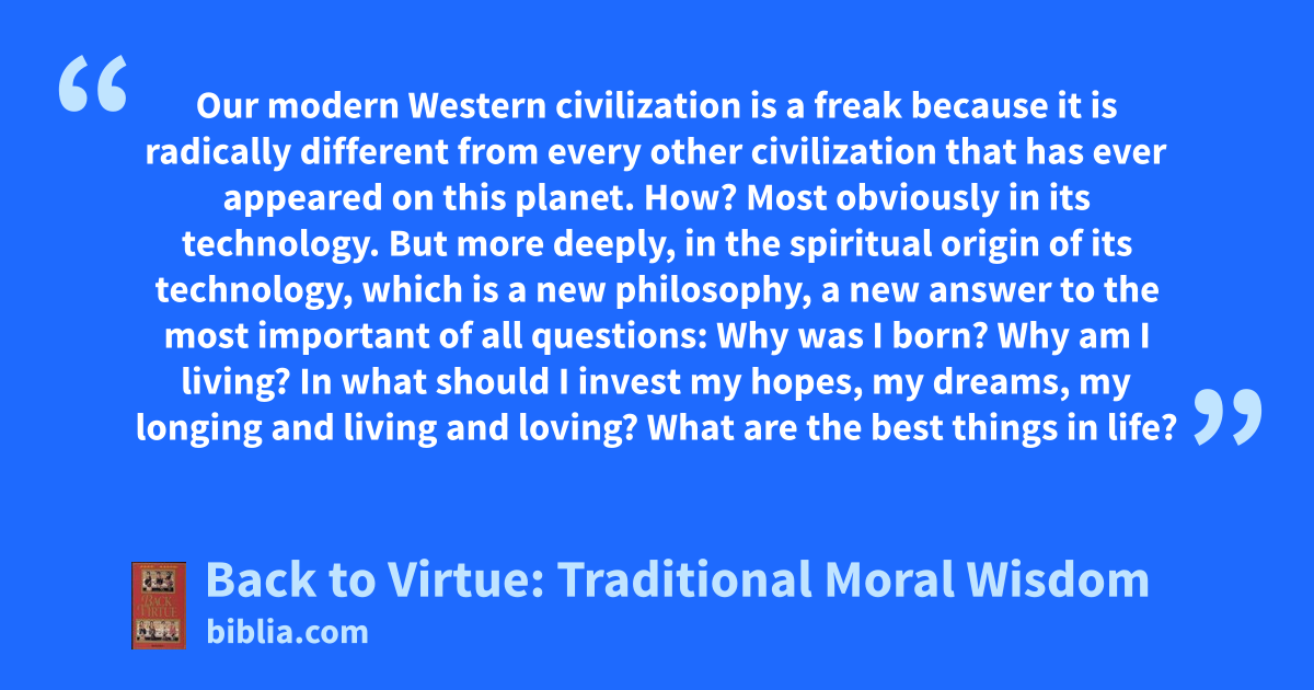 Our modern Western civilization is a freak because it is radically different from every other civilization that has ever appeared on this planet. How? Most obviously in its technology. But more deeply, in the spiritual origin of its technology, which is a new philosophy, a new answer to the most important of all questions: Why was I born? Why am I living? In what should I invest my hopes, my dreams, my longing and living and loving? What are the best things in life?