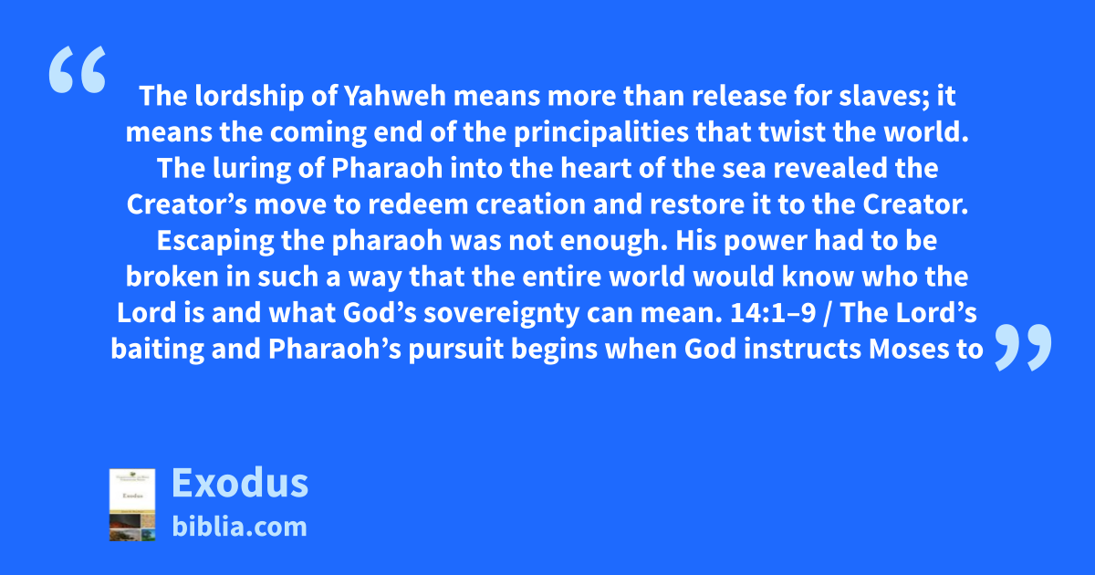 The lordship of Yahweh means more than release for slaves; it means the coming end of the principalities that twist the world. The luring of Pharaoh into the heart of the sea revealed the Creator’s move to redeem creation and restore it to the Creator. Escaping the pharaoh was not enough. His power had to be broken in such a way that the entire world would know who the Lord is and what God’s sovereignty can mean. 14:1–9 / The Lord’s baiting and Pharaoh’s pursuit begins when God instructs Moses to