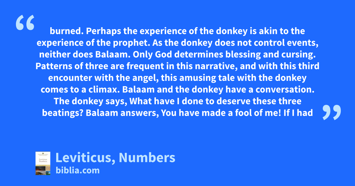 burned. Perhaps the experience of the donkey is akin to the experience of the prophet. As the donkey does not control events, neither does Balaam. Only God determines blessing and cursing. Patterns of three are frequent in this narrative, and with this third encounter with the angel, this amusing tale with the donkey comes to a climax. Balaam and the donkey have a conversation. The donkey says, What have I done to deserve these three beatings? Balaam answers, You have made a fool of me! If I had