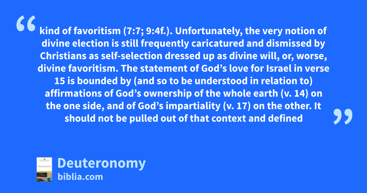 kind of favoritism (7:7; 9:4f.). Unfortunately, the very notion of divine election is still frequently caricatured and dismissed by Christians as self-selection dressed up as divine will, or, worse, divine favoritism. The statement of God’s love for Israel in verse 15 is bounded by (and so to be understood in relation to) affirmations of God’s ownership of the whole earth (v. 14) on the one side, and of God’s impartiality (v. 17) on the other. It should not be pulled out of that context and defined
