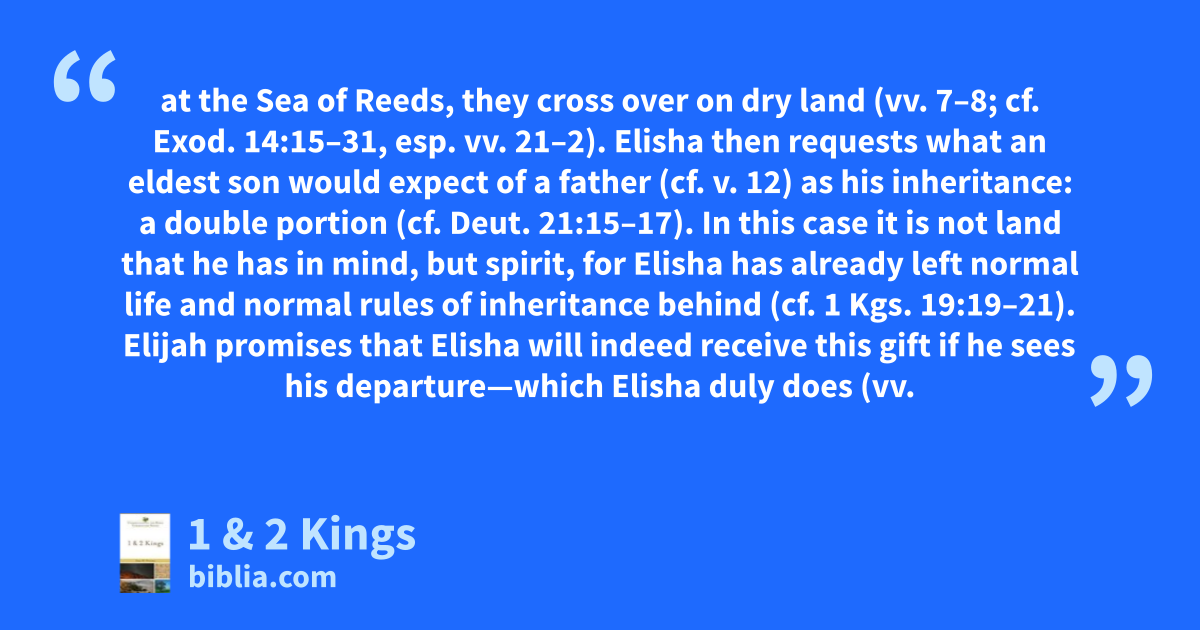at the Sea of Reeds, they cross over on dry land (vv. 7–8; cf. Exod. 14:15–31, esp. vv. 21–2). Elisha then requests what an eldest son would expect of a father (cf. v. 12) as his inheritance: a double portion (cf. Deut. 21:15–17). In this case it is not land that he has in mind, but spirit, for Elisha has already left normal life and normal rules of inheritance behind (cf. 1 Kgs. 19:19–21). Elijah promises that Elisha will indeed receive this gift if he sees his departure—which Elisha duly does (vv.