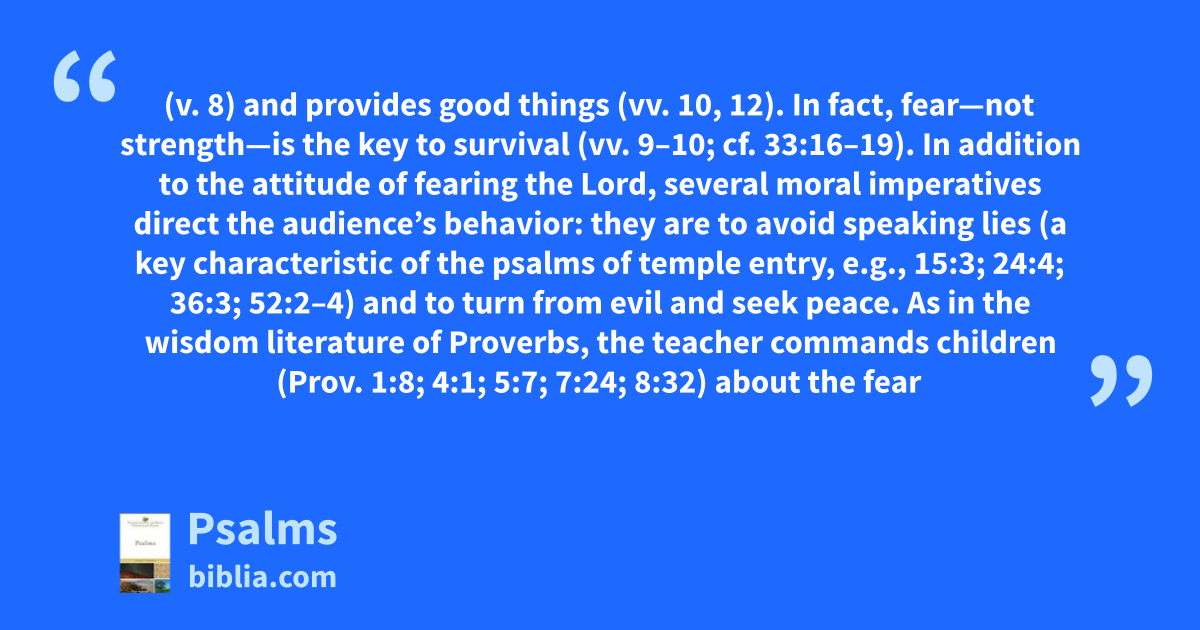 (v. 8) and provides good things (vv. 10, 12). In fact, fear—not strength—is the key to survival (vv. 9–10; cf. 33:16–19). In addition to the attitude of fearing the Lord, several moral imperatives direct the audience’s behavior: they are to avoid speaking lies (a key characteristic of the psalms of temple entry, e.g., 15:3; 24:4; 36:3; 52:2–4) and to turn from evil and seek peace. As in the wisdom literature of Proverbs, the teacher commands children (Prov. 1:8; 4:1; 5:7; 7:24; 8:32) about the fear