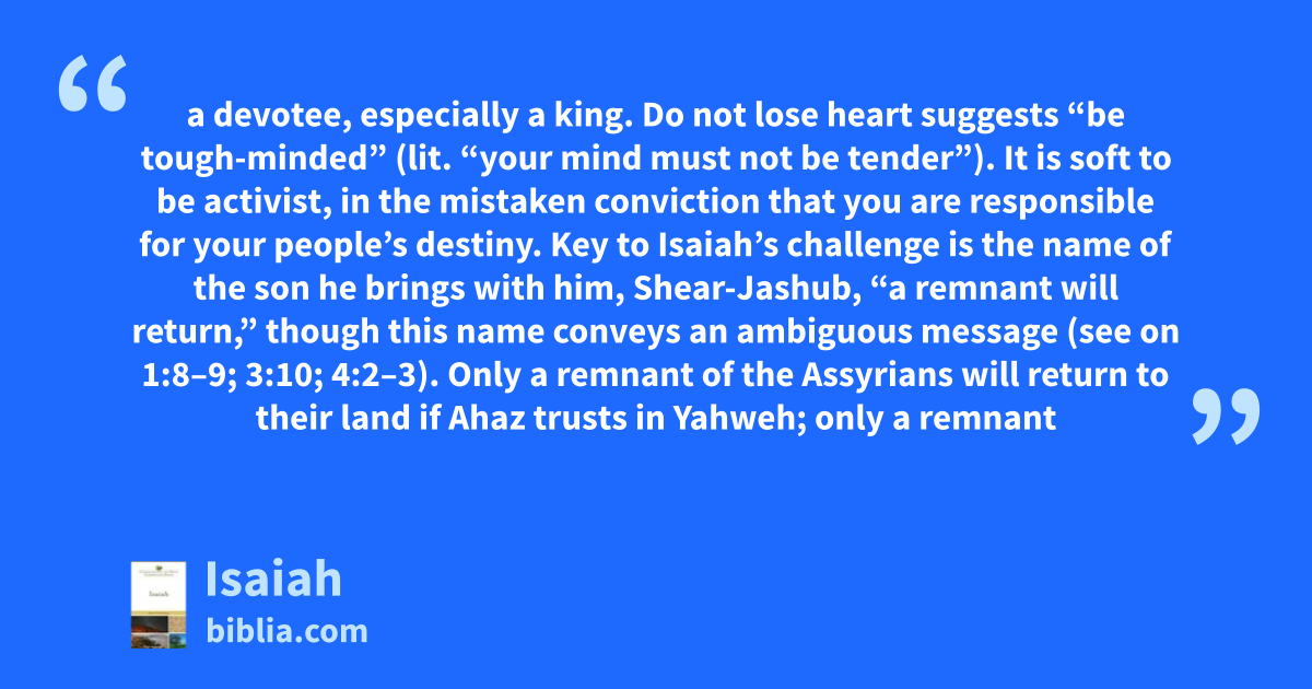 a devotee, especially a king. Do not lose heart suggests “be tough-minded” (lit. “your mind must not be tender”). It is soft to be activist, in the mistaken conviction that you are responsible for your people’s destiny. Key to Isaiah’s challenge is the name of the son he brings with him, Shear-Jashub, “a remnant will return,” though this name conveys an ambiguous message (see on 1:8–9; 3:10; 4:2–3). Only a remnant of the Assyrians will return to their land if Ahaz trusts in Yahweh; only a remnant