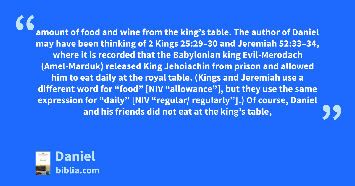amount of food and wine from the king’s table. The author of Daniel may have been thinking of 2 Kings 25:29–30 and Jeremiah 52:33–34, where it is recorded that the Babylonian king Evil-Merodach (Amel-Marduk) released King Jehoiachin from prison and allowed him to eat daily at the royal table. (Kings and Jeremiah use a different word for “food” [NIV “allowance”], but they use the same expression for “daily” [NIV “regular/ regularly”].) Of course, Daniel and his friends did not eat at the king’s table,