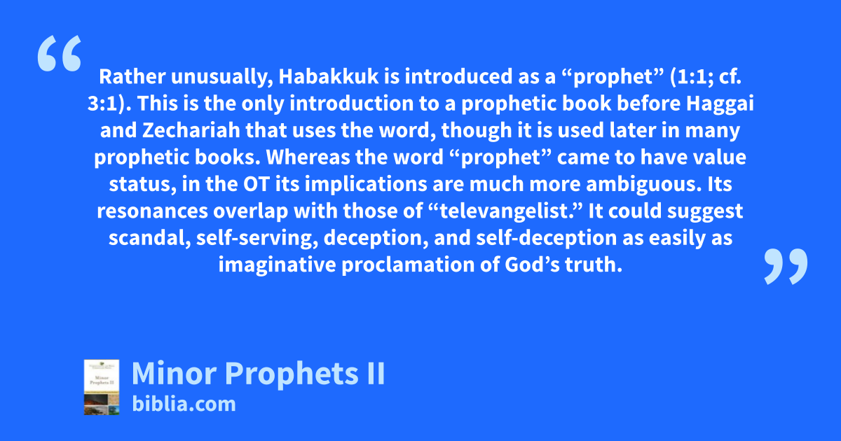 Rather unusually, Habakkuk is introduced as a “prophet” (1:1; cf. 3:1). This is the only introduction to a prophetic book before Haggai and Zechariah that uses the word, though it is used later in many prophetic books. Whereas the word “prophet” came to have value status, in the OT its implications are much more ambiguous. Its resonances overlap with those of “televangelist.” It could suggest scandal, self-serving, deception, and self-deception as easily as imaginative proclamation of God’s truth.