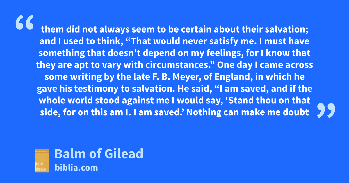 them did not always seem to be certain about their salvation; and I used to think, “That would never satisfy me. I must have something that doesn’t depend on my feelings, for I know that they are apt to vary with circumstances.” One day I came across some writing by the late F. B. Meyer, of England, in which he gave his testimony to salvation. He said, “I am saved, and if the whole world stood against me I would say, ‘Stand thou on that side, for on this am I. I am saved.’ Nothing can make me doubt