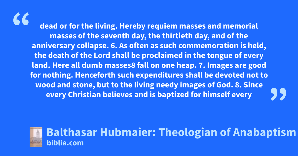 dead or for the living. Hereby requiem masses and memorial masses of the seventh day, the thirtieth day, and of the anniversary collapse. 6. As often as such commemoration is held, the death of the Lord shall be proclaimed in the tongue of every land. Here all dumb masses8 fall on one heap. 7. Images are good for nothing. Henceforth such expenditures shall be devoted not to wood and stone, but to the living needy images of God. 8. Since every Christian believes and is baptized for himself every