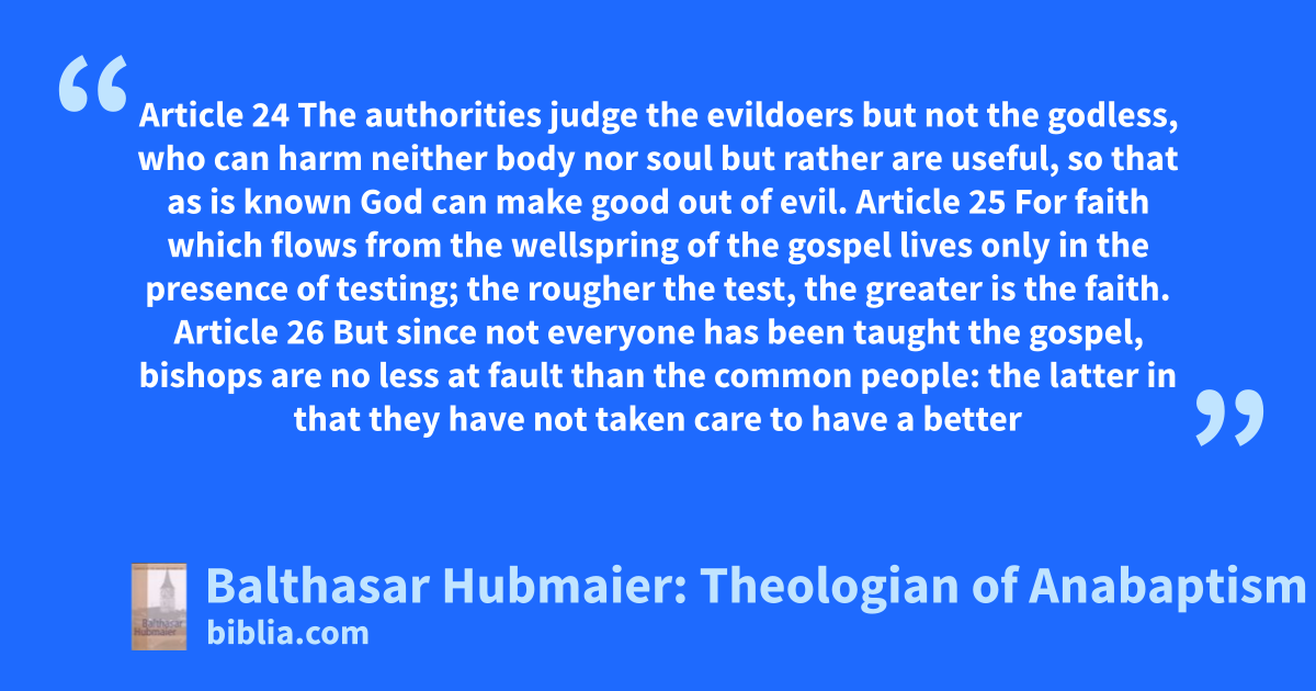 Article 24 The authorities judge the evildoers but not the godless, who can harm neither body nor soul but rather are useful, so that as is known God can make good out of evil. Article 25 For faith which flows from the wellspring of the gospel lives only in the presence of testing; the rougher the test, the greater is the faith. Article 26 But since not everyone has been taught the gospel, bishops are no less at fault than the common people: the latter in that they have not taken care to have a better