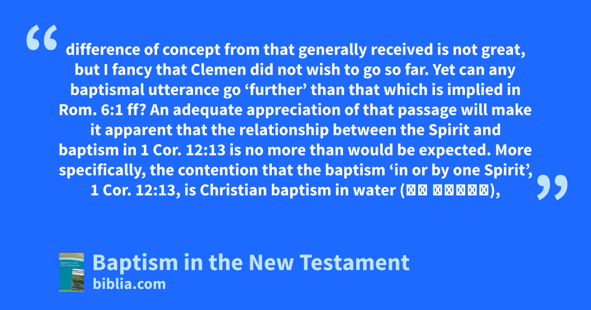 difference of concept from that generally received is not great, but I fancy that Clemen did not wish to go so far. Yet can any baptismal utterance go ‘further’ than that which is implied in Rom. 6:1 ff? An adequate appreciation of that passage will make it apparent that the relationship between the Spirit and baptism in 1 Cor. 12:13 is no more than would be expected. More specifically, the contention that the baptism ‘in or by one Spirit’, 1 Cor. 12:13, is Christian baptism in water (ἐν ὕδατι),