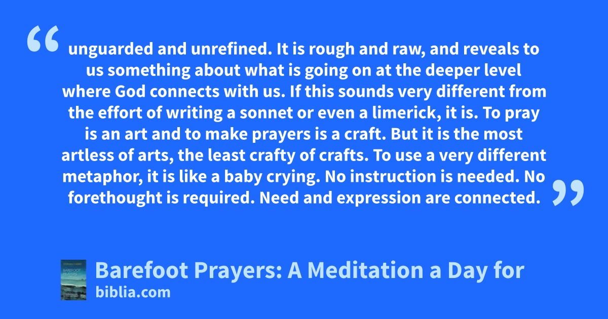 unguarded and unrefined. It is rough and raw, and reveals to us something about what is going on at the deeper level where God connects with us. If this sounds very different from the effort of writing a sonnet or even a limerick, it is. To pray is an art and to make prayers is a craft. But it is the most artless of arts, the least crafty of crafts. To use a very different metaphor, it is like a baby crying. No instruction is needed. No forethought is required. Need and expression are connected.
