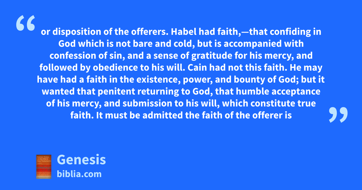 or disposition of the offerers. Habel had faith,—that confiding in God which is not bare and cold, but is accompanied with confession of sin, and a sense of gratitude for his mercy, and followed by obedience to his will. Cain had not this faith. He may have had a faith in the existence, power, and bounty of God; but it wanted that penitent returning to God, that humble acceptance of his mercy, and submission to his will, which constitute true faith. It must be admitted the faith of the offerer is