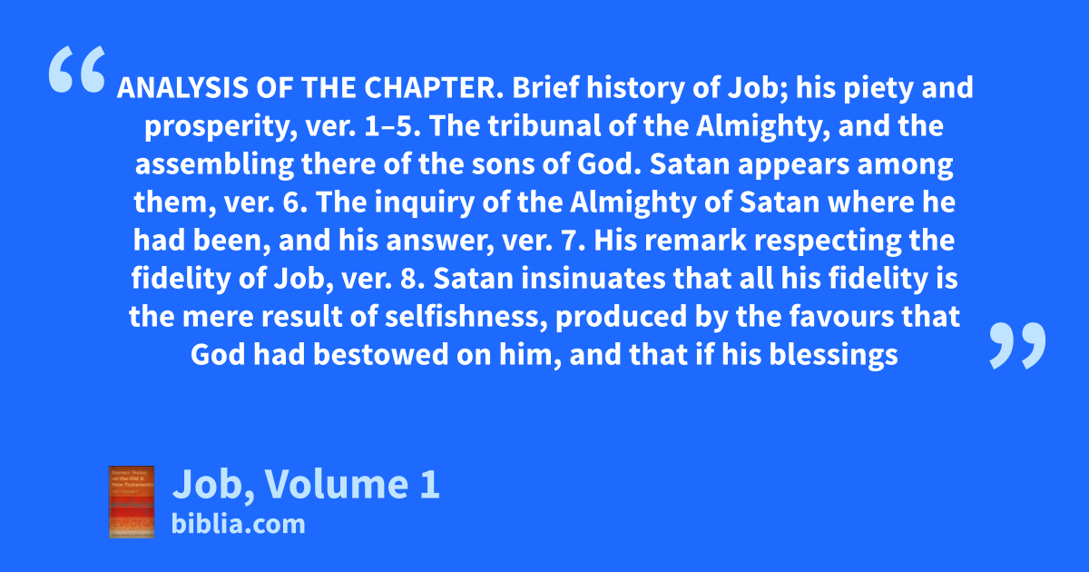 ANALYSIS OF THE CHAPTER. Brief history of Job; his piety and prosperity, ver. 1–5. The tribunal of the Almighty, and the assembling there of the sons of God. Satan appears among them, ver. 6. The inquiry of the Almighty of Satan where he had been, and his answer, ver. 7. His remark respecting the fidelity of Job, ver. 8. Satan insinuates that all his fidelity is the mere result of selfishness, produced by the favours that God had bestowed on him, and that if his blessings