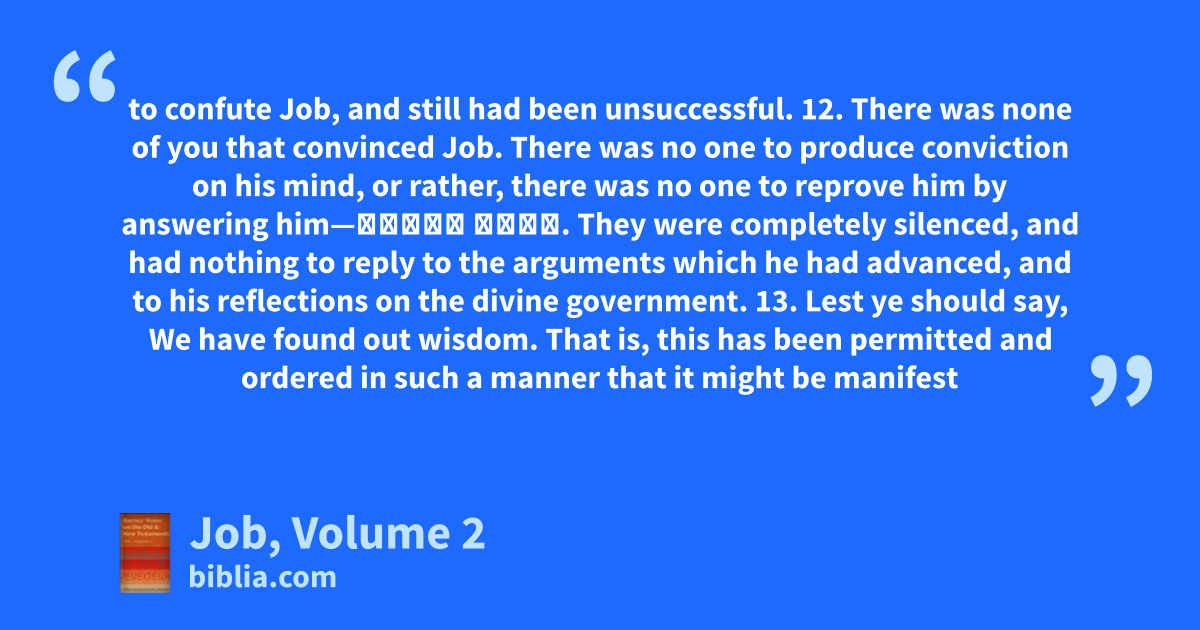 to confute Job, and still had been unsuccessful. 12. There was none of you that convinced Job. There was no one to produce conviction on his mind, or rather, there was no one to reprove him by answering him—מוכיח עונה. They were completely silenced, and had nothing to reply to the arguments which he had advanced, and to his reflections on the divine government. 13. Lest ye should say, We have found out wisdom. That is, this has been permitted and ordered in such a manner that it might be manifest