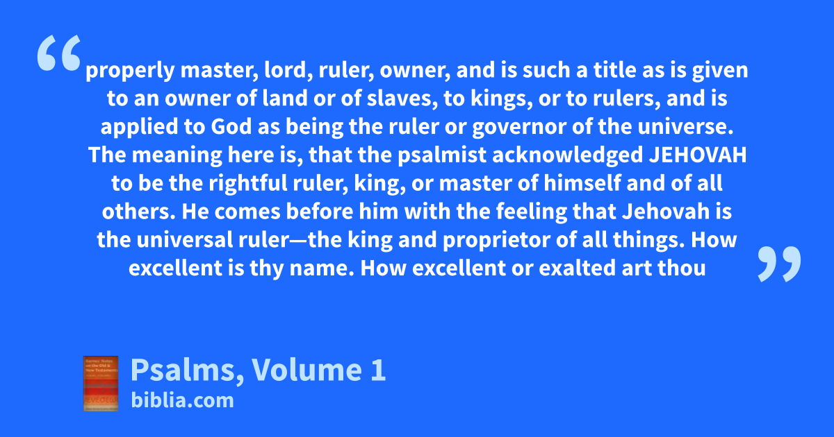 properly master, lord, ruler, owner, and is such a title as is given to an owner of land or of slaves, to kings, or to rulers, and is applied to God as being the ruler or governor of the universe. The meaning here is, that the psalmist acknowledged JEHOVAH to be the rightful ruler, king, or master of himself and of all others. He comes before him with the feeling that Jehovah is the universal ruler—the king and proprietor of all things. How excellent is thy name. How excellent or exalted art thou