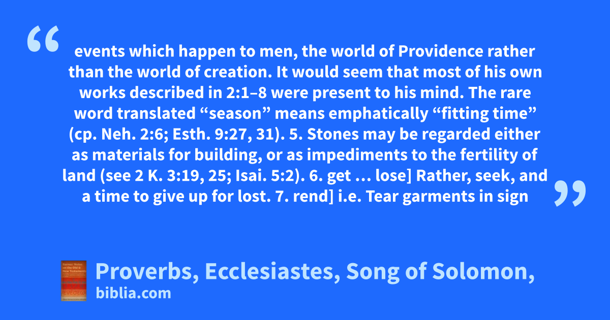 events which happen to men, the world of Providence rather than the world of creation. It would seem that most of his own works described in 2:1–8 were present to his mind. The rare word translated “season” means emphatically “fitting time” (cp. Neh. 2:6; Esth. 9:27, 31). 5. Stones may be regarded either as materials for building, or as impediments to the fertility of land (see 2 K. 3:19, 25; Isai. 5:2). 6. get … lose] Rather, seek, and a time to give up for lost. 7. rend] i.e. Tear garments in sign