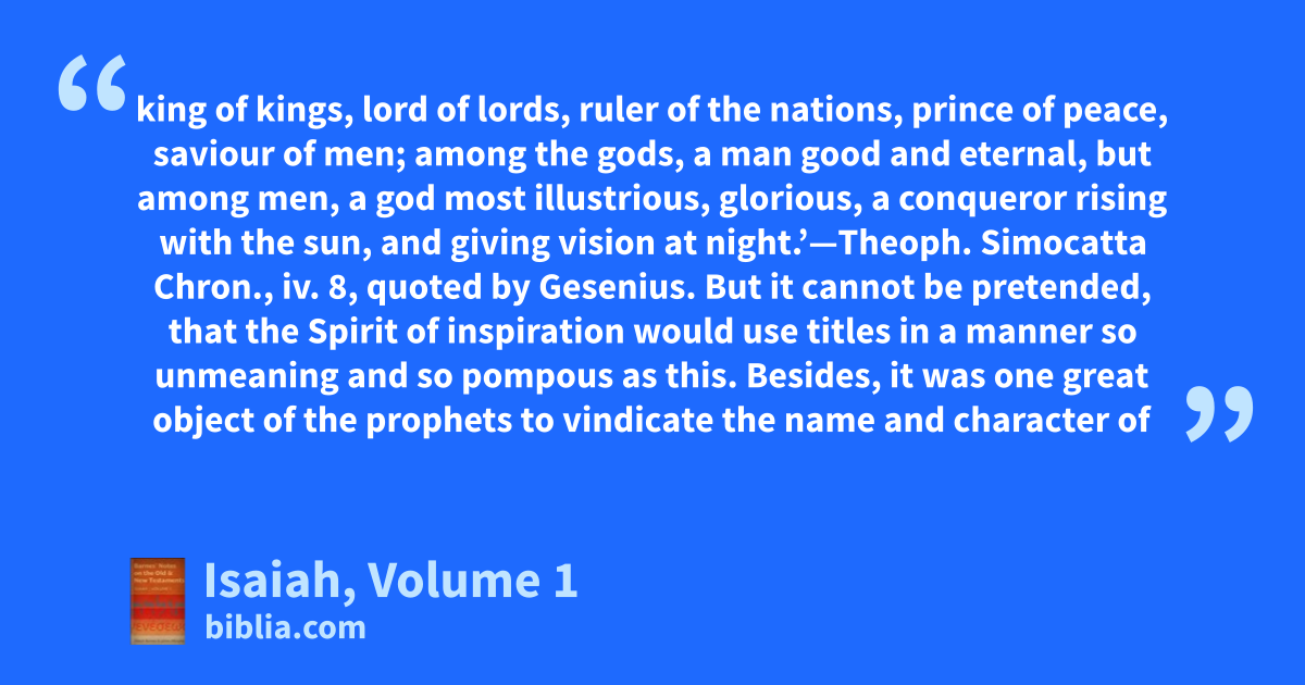 king of kings, lord of lords, ruler of the nations, prince of peace, saviour of men; among the gods, a man good and eternal, but among men, a god most illustrious, glorious, a conqueror rising with the sun, and giving vision at night.’—Theoph. Simocatta Chron., iv. 8, quoted by Gesenius. But it cannot be pretended, that the Spirit of inspiration would use titles in a manner so unmeaning and so pompous as this. Besides, it was one great object of the prophets to vindicate the name and character of