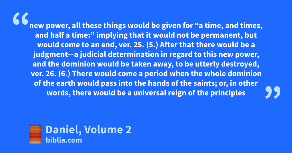 new power, all these things would be given for “a time, and times, and half a time:” implying that it would not be permanent, but would come to an end, ver. 25. (5.) After that there would be a judgment—a judicial determination in regard to this new power, and the dominion would be taken away, to be utterly destroyed, ver. 26. (6.) There would come a period when the whole dominion of the earth would pass into the hands of the saints; or, in other words, there would be a universal reign of the principles