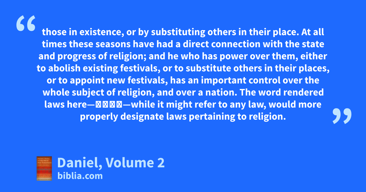 those in existence, or by substituting others in their place. At all times these seasons have had a direct connection with the state and progress of religion; and he who has power over them, either to abolish existing festivals, or to substitute others in their places, or to appoint new festivals, has an important control over the whole subject of religion, and over a nation. The word rendered laws here—דָּת—while it might refer to any law, would more properly designate laws pertaining to religion.