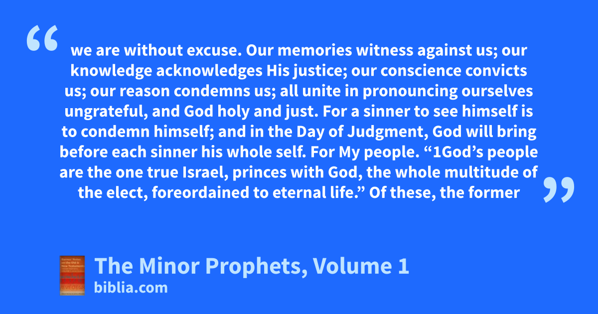 we are without excuse. Our memories witness against us; our knowledge acknowledges His justice; our conscience convicts us; our reason condemns us; all unite in pronouncing ourselves ungrateful, and God holy and just. For a sinner to see himself is to condemn himself; and in the Day of Judgment, God will bring before each sinner his whole self. For My people. “1God’s people are the one true Israel, princes with God, the whole multitude of the elect, foreordained to eternal life.” Of these, the former