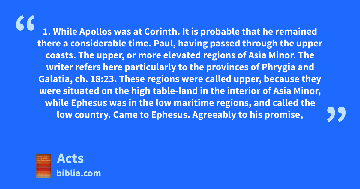 1. While Apollos was at Corinth. It is probable that he remained there a considerable time. Paul, having passed through the upper coasts. The upper, or more elevated regions of Asia Minor. The writer refers here particularly to the provinces of Phrygia and Galatia, ch. 18:23. These regions were called upper, because they were situated on the high table-land in the interior of Asia Minor, while Ephesus was in the low maritime regions, and called the low country. Came to Ephesus. Agreeably to his promise,