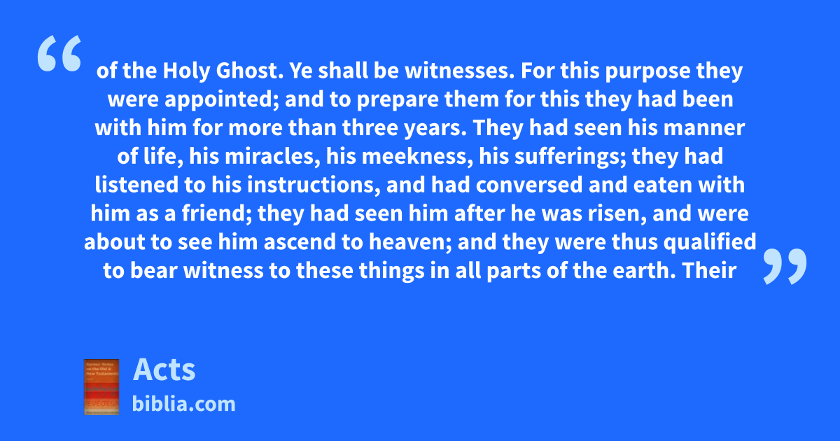 of the Holy Ghost. Ye shall be witnesses. For this purpose they were appointed; and to prepare them for this they had been with him for more than three years. They had seen his manner of life, his miracles, his meekness, his sufferings; they had listened to his instructions, and had conversed and eaten with him as a friend; they had seen him after he was risen, and were about to see him ascend to heaven; and they were thus qualified to bear witness to these things in all parts of the earth. Their