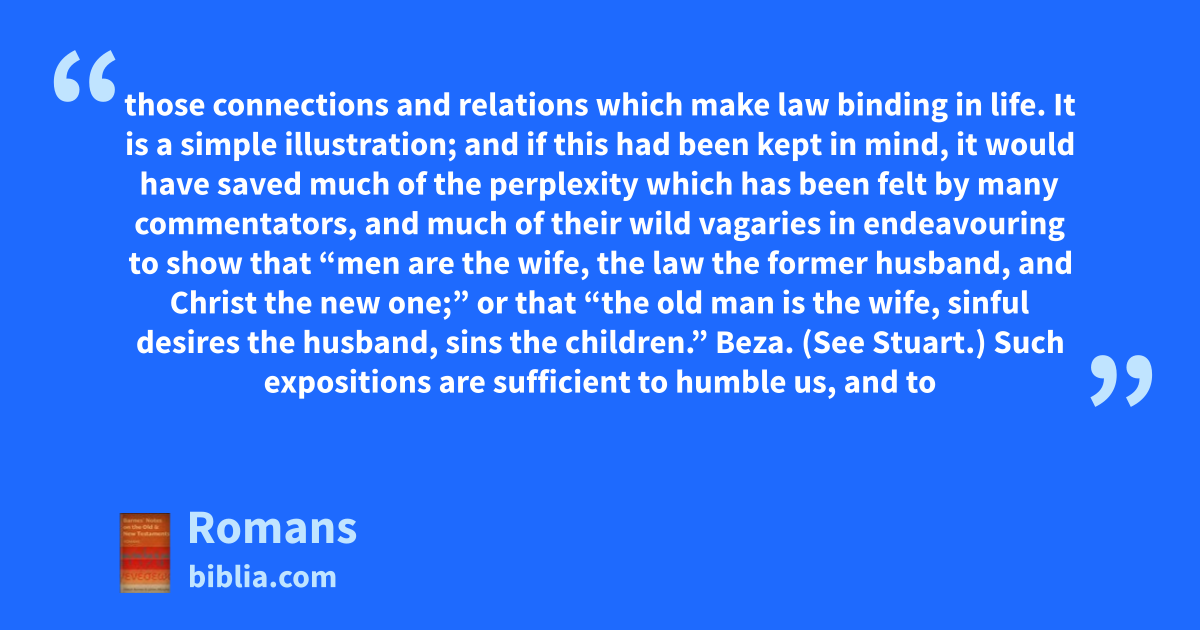 those connections and relations which make law binding in life. It is a simple illustration; and if this had been kept in mind, it would have saved much of the perplexity which has been felt by many commentators, and much of their wild vagaries in endeavouring to show that “men are the wife, the law the former husband, and Christ the new one;” or that “the old man is the wife, sinful desires the husband, sins the children.” Beza. (See Stuart.) Such expositions are sufficient to humble us, and to