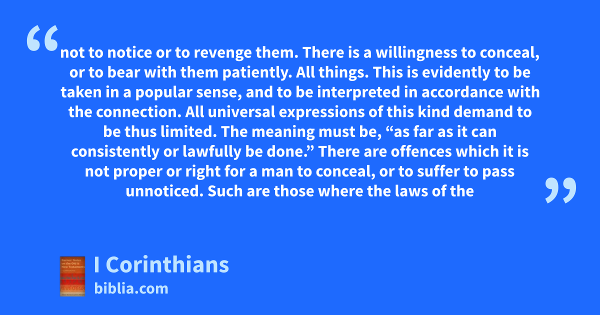 not to notice or to revenge them. There is a willingness to conceal, or to bear with them patiently. All things. This is evidently to be taken in a popular sense, and to be interpreted in accordance with the connection. All universal expressions of this kind demand to be thus limited. The meaning must be, “as far as it can consistently or lawfully be done.” There are offences which it is not proper or right for a man to conceal, or to suffer to pass unnoticed. Such are those where the laws of the