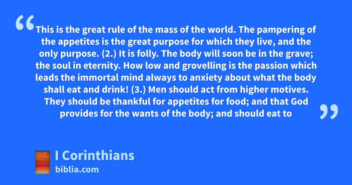 This is the great rule of the mass of the world. The pampering of the appetites is the great purpose for which they live, and the only purpose. (2.) It is folly. The body will soon be in the grave; the soul in eternity. How low and grovelling is the passion which leads the immortal mind always to anxiety about what the body shall eat and drink! (3.) Men should act from higher motives. They should be thankful for appetites for food; and that God provides for the wants of the body; and should eat to