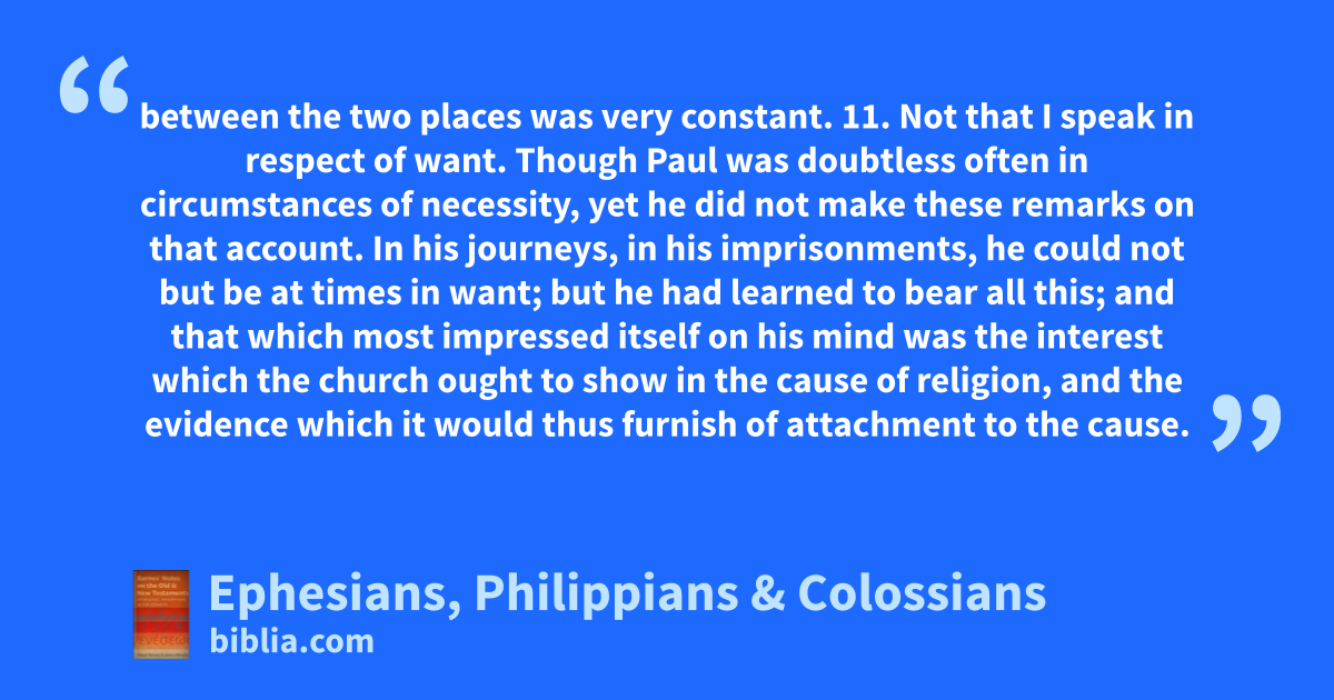between the two places was very constant. 11. Not that I speak in respect of want. Though Paul was doubtless often in circumstances of necessity, yet he did not make these remarks on that account. In his journeys, in his imprisonments, he could not but be at times in want; but he had learned to bear all this; and that which most impressed itself on his mind was the interest which the church ought to show in the cause of religion, and the evidence which it would thus furnish of attachment to the cause.
