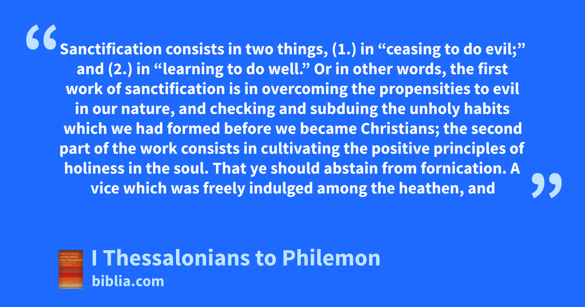 Sanctification consists in two things, (1.) in “ceasing to do evil;” and (2.) in “learning to do well.” Or in other words, the first work of sanctification is in overcoming the propensities to evil in our nature, and checking and subduing the unholy habits which we had formed before we became Christians; the second part of the work consists in cultivating the positive principles of holiness in the soul. That ye should abstain from fornication. A vice which was freely indulged among the heathen, and