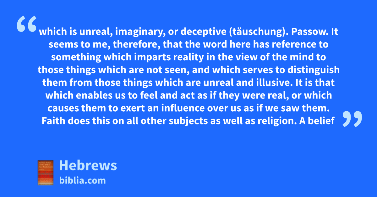 which is unreal, imaginary, or deceptive (täuschung). Passow. It seems to me, therefore, that the word here has reference to something which imparts reality in the view of the mind to those things which are not seen, and which serves to distinguish them from those things which are unreal and illusive. It is that which enables us to feel and act as if they were real, or which causes them to exert an influence over us as if we saw them. Faith does this on all other subjects as well as religion. A belief