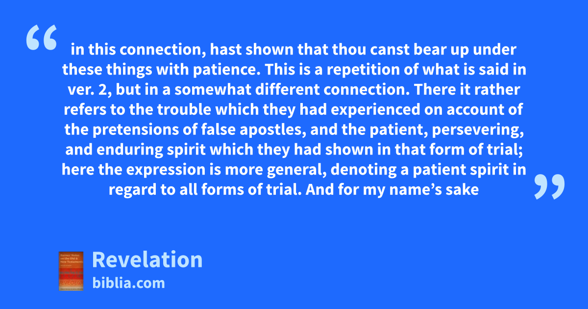 in this connection, hast shown that thou canst bear up under these things with patience. This is a repetition of what is said in ver. 2, but in a somewhat different connection. There it rather refers to the trouble which they had experienced on account of the pretensions of false apostles, and the patient, persevering, and enduring spirit which they had shown in that form of trial; here the expression is more general, denoting a patient spirit in regard to all forms of trial. And for my name’s sake