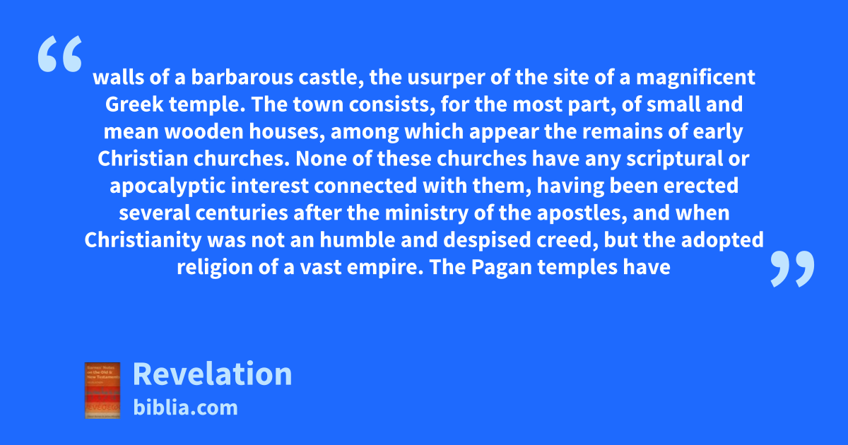walls of a barbarous castle, the usurper of the site of a magnificent Greek temple. The town consists, for the most part, of small and mean wooden houses, among which appear the remains of early Christian churches. None of these churches have any scriptural or apocalyptic interest connected with them, having been erected several centuries after the ministry of the apostles, and when Christianity was not an humble and despised creed, but the adopted religion of a vast empire. The Pagan temples have