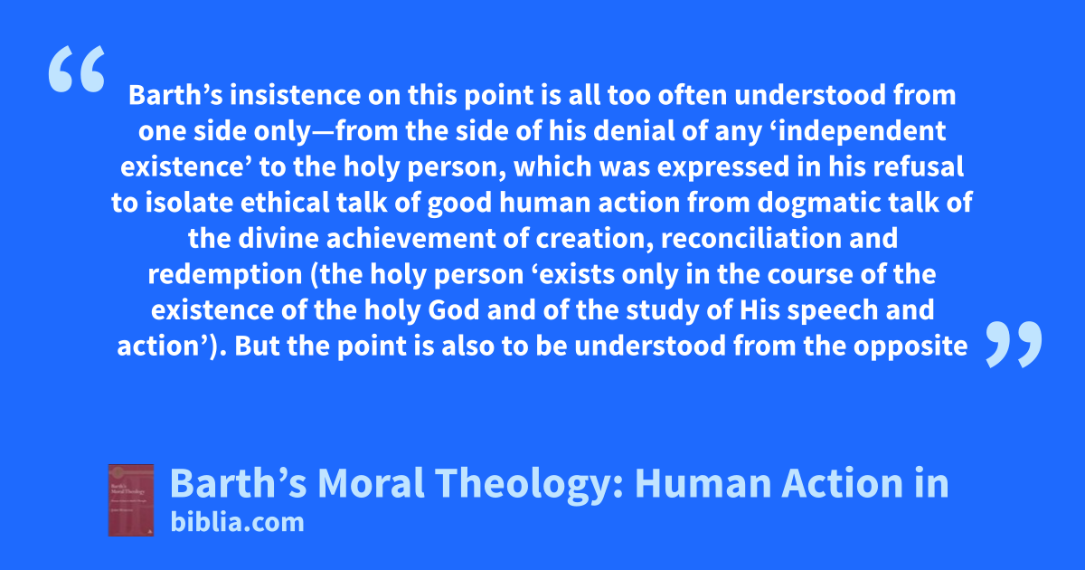 Barth’s insistence on this point is all too often understood from one side only—from the side of his denial of any ‘independent existence’ to the holy person, which was expressed in his refusal to isolate ethical talk of good human action from dogmatic talk of the divine achievement of creation, reconciliation and redemption (the holy person ‘exists only in the course of the existence of the holy God and of the study of His speech and action’). But the point is also to be understood from the opposite