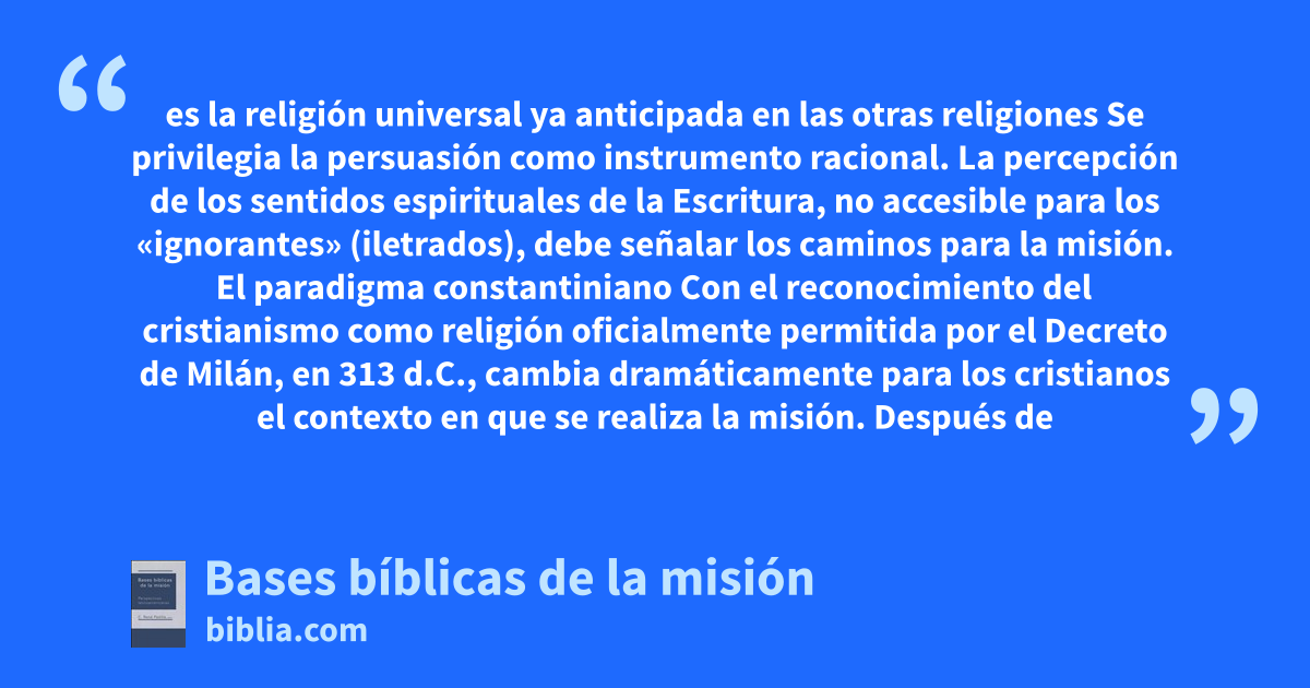 es la religión universal ya anticipada en las otras religiones Se privilegia la persuasión como instrumento racional. La percepción de los sentidos espirituales de la Escritura, no accesible para los «ignorantes» (iletrados), debe señalar los caminos para la misión. El paradigma constantiniano Con el reconocimiento del cristianismo como religión oficialmente permitida por el Decreto de Milán, en 313 d.C., cambia dramáticamente para los cristianos el contexto en que se realiza la misión. Después de