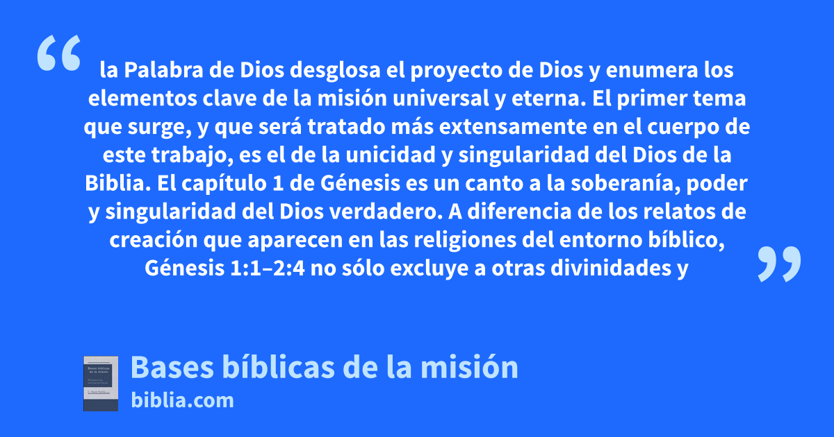la Palabra de Dios desglosa el proyecto de Dios y enumera los elementos clave de la misión universal y eterna. El primer tema que surge, y que será tratado más extensamente en el cuerpo de este trabajo, es el de la unicidad y singularidad del Dios de la Biblia. El capítulo 1 de Génesis es un canto a la soberanía, poder y singularidad del Dios verdadero. A diferencia de los relatos de creación que aparecen en las religiones del entorno bíblico, Génesis 1:1–2:4 no sólo excluye a otras divinidades y